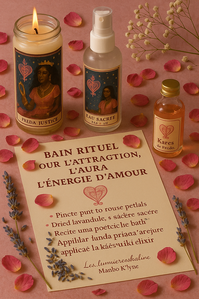 Bain rituel dédié à l’attraction, à l’aura magnétique et à l’énergie d’amour, sous la bénédiction de la loa Ezili Freda, loa de l’amour, du luxe, de la beauté et du raffinement.